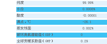 保賜利R-134a雪種料液來源ICI,系出名門,優良的品質會保證你放心的度過每一個炎熱的夏天,質量指標如下: