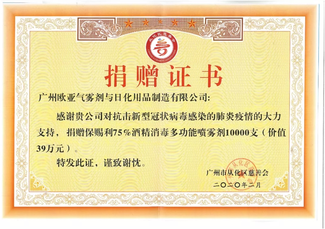 隨著新型冠狀病毒感染肺炎疫情進一步發展,抗疫前線急需大量抗疫物資。香港主板上市企業保寶龍科技控股有限公司(1861.HK)旗下2家全資子公司廣州保賜利化工有限公司、廣州歐亞氣霧劑與日化用品制造有限公司用積極行動響應政府號召;廣州保賜利繼2月1日捐贈首批物資泰國產醫護型口罩后,于2月6日又聯合廣州歐亞向廣州市從化區慈善會捐贈第二批物資;保賜利75%酒精消毒多功能噴霧、保賜利空氣消毒殺菌劑各10000瓶,總價值78萬元人民幣,用于抗擊新冠肺炎疫情。捐贈廣州從化的第三批物資正在加緊準備之中,力爭近日送達。
