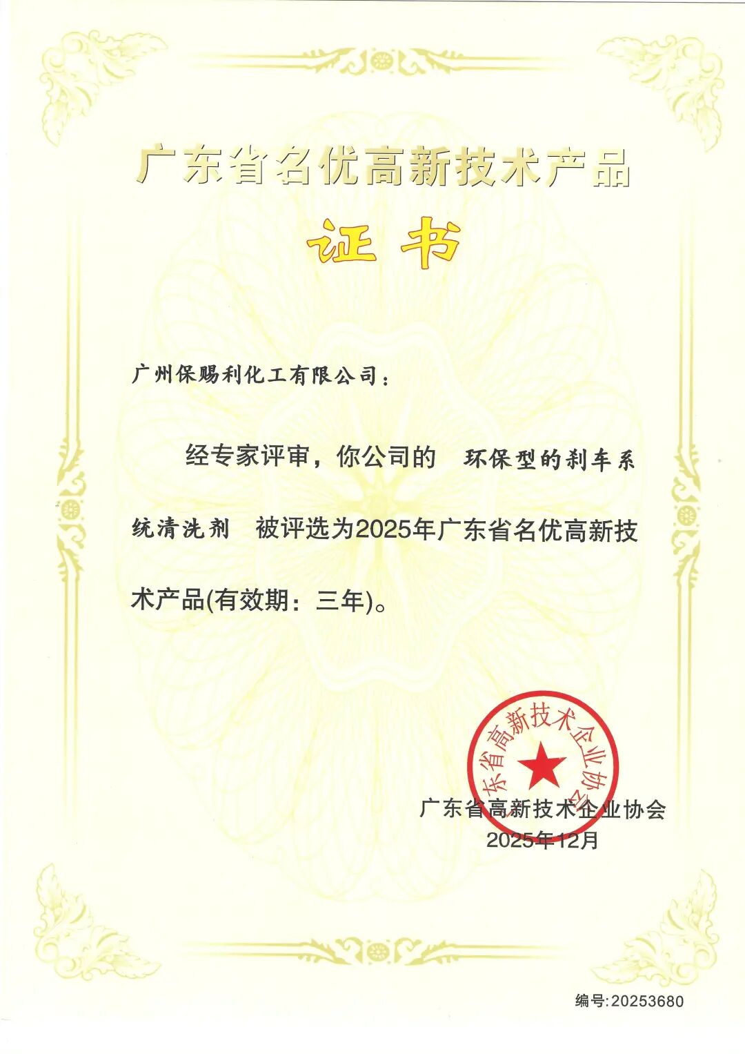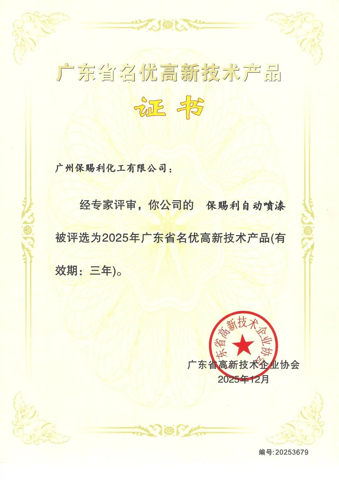 保賜利自動噴漆、環保剎車系統清洗劑被評選為“2025年廣東省名優高新技術產品”
