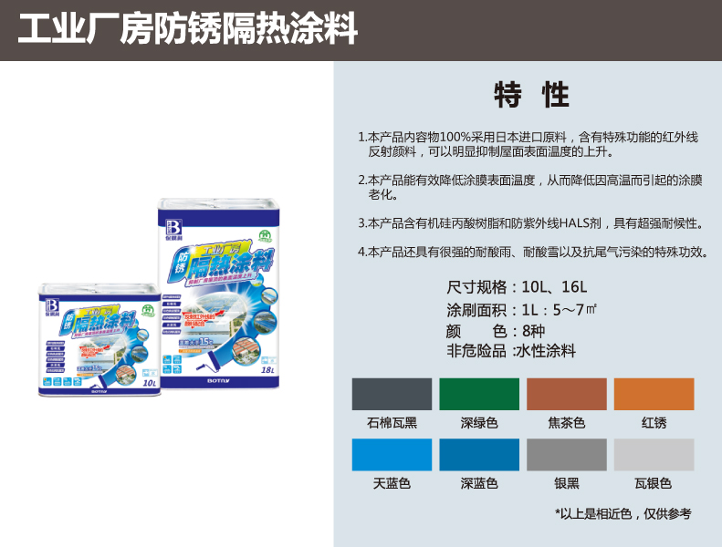 特性:本產品內容物采用100%的進口原裝材料,里面含有特殊的紅外線反射顏料和空中微粒,可以明顯抑制屋面表面溫度上升。這種涂料還有降低涂膜表面溫度,從而降低因為高溫而引起的涂膜老化,除此之外這種節能隔熱降溫涂料還具有防水的功能和防銹的功能,價格方面跟同種涂料也占有極大的優勢,反射隔熱涂料價格可向公司相關銷售人員咨詢。